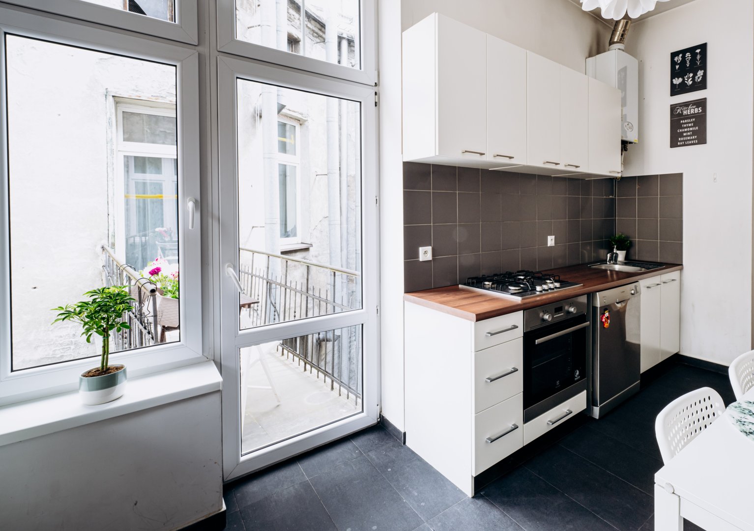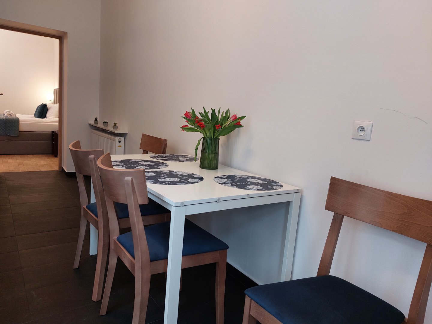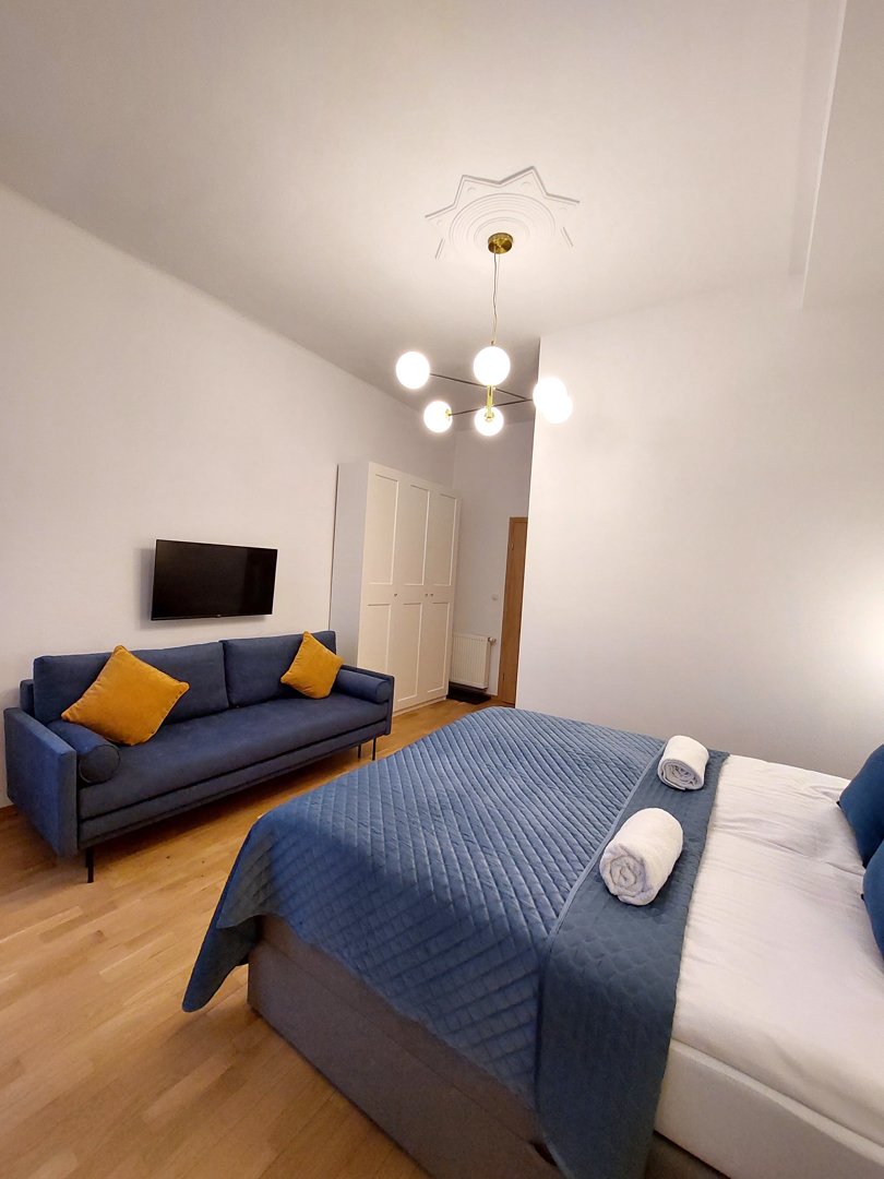 Duży, nowoczesny, dwupokojowy apartament dla 6 osób z balkonem wychodzącym na spokojne podwórko – osobna sypialnia z dwoma łóżkami pojedynczymi zapewnia wygodę dla grup.