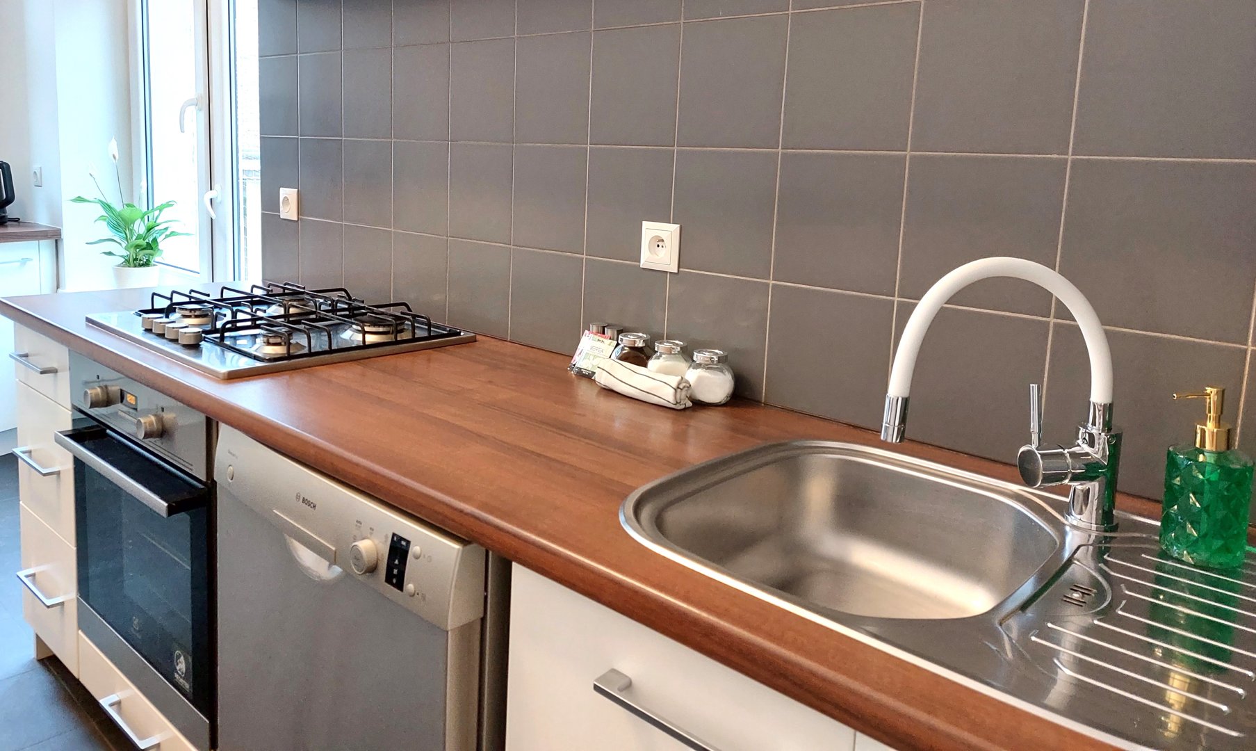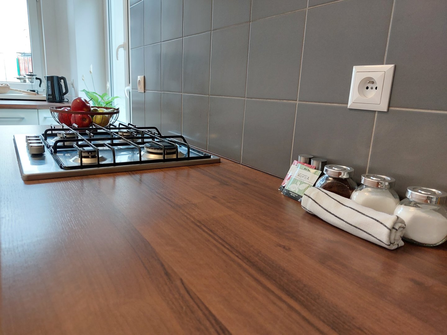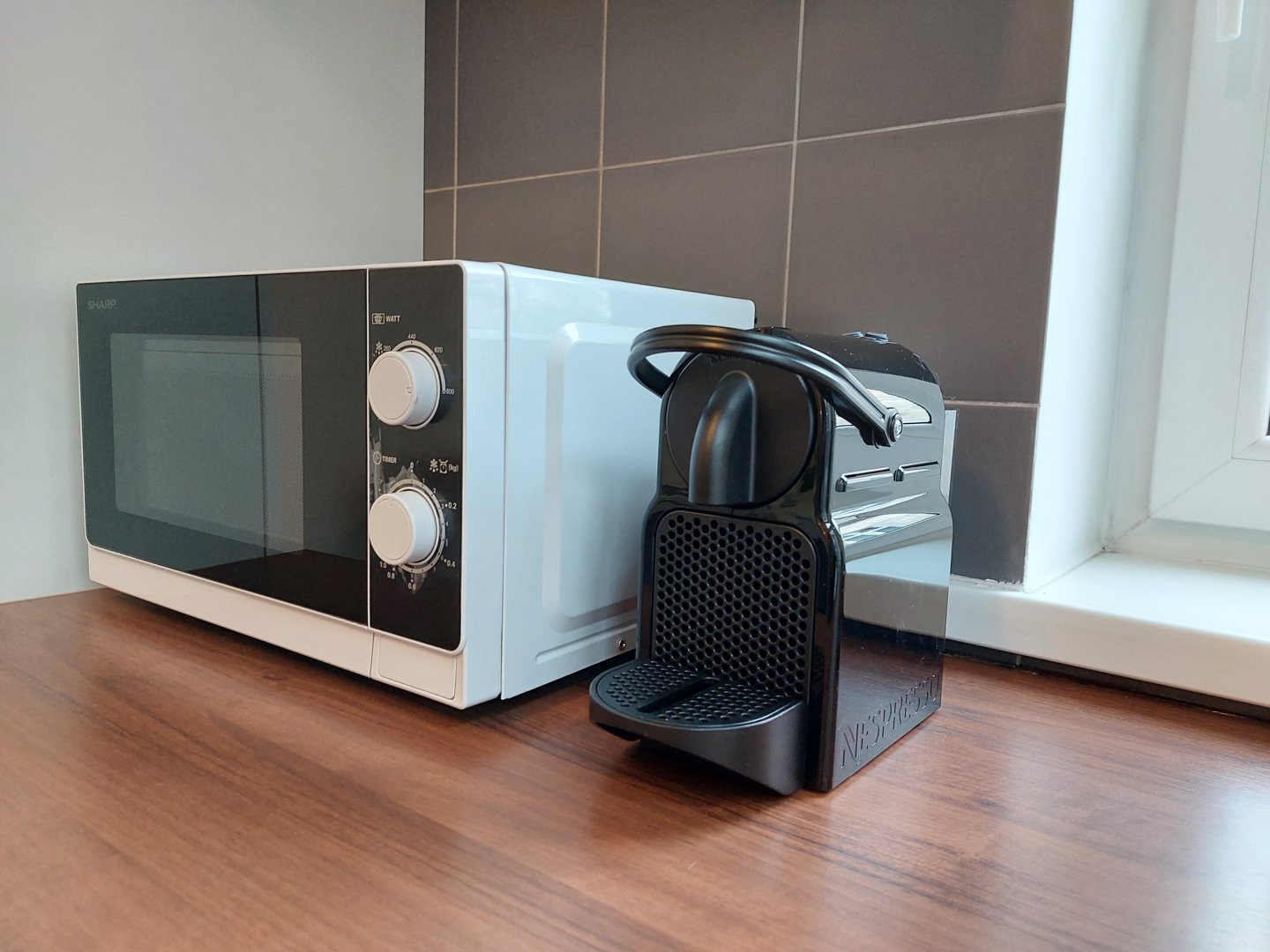 W apartamencie znajduje się w pełni wyposażony aneks kuchenny z płytą grzewczą, czajnikiem, przyborami kuchennymi, a także kawiarką i ekspresem na kapsułki. Do dyspozycji gości jest również część jadalniana.