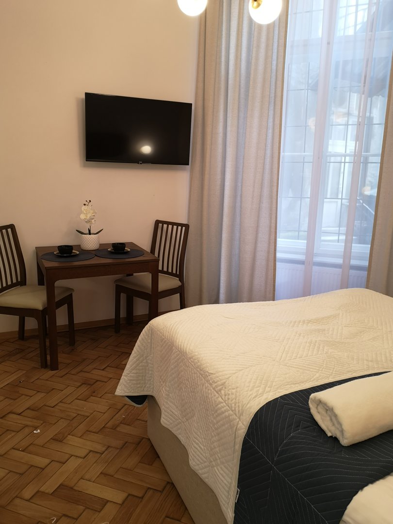 Jednopokojowy apartament dla 4 osób z balkonem od strony ulicy i klimatyzacją – wygodna przestrzeń w samym centrum Krakowa.