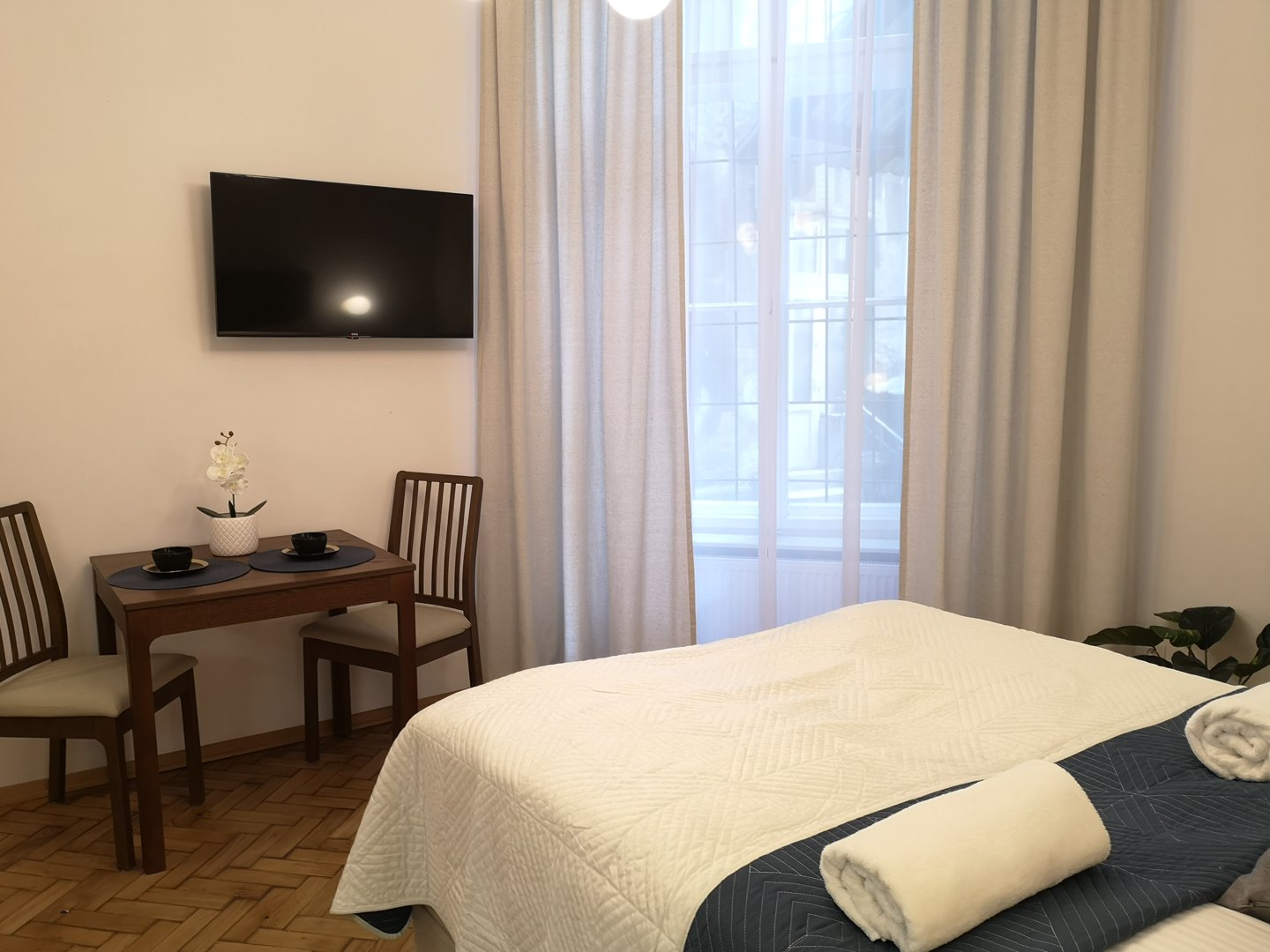 Przestronny apartament dla 2 osób z oddzielną kuchnią i balkonem na cichy dziedziniec – więcej przestrzeni i spokoju w samym centrum Krakowa.