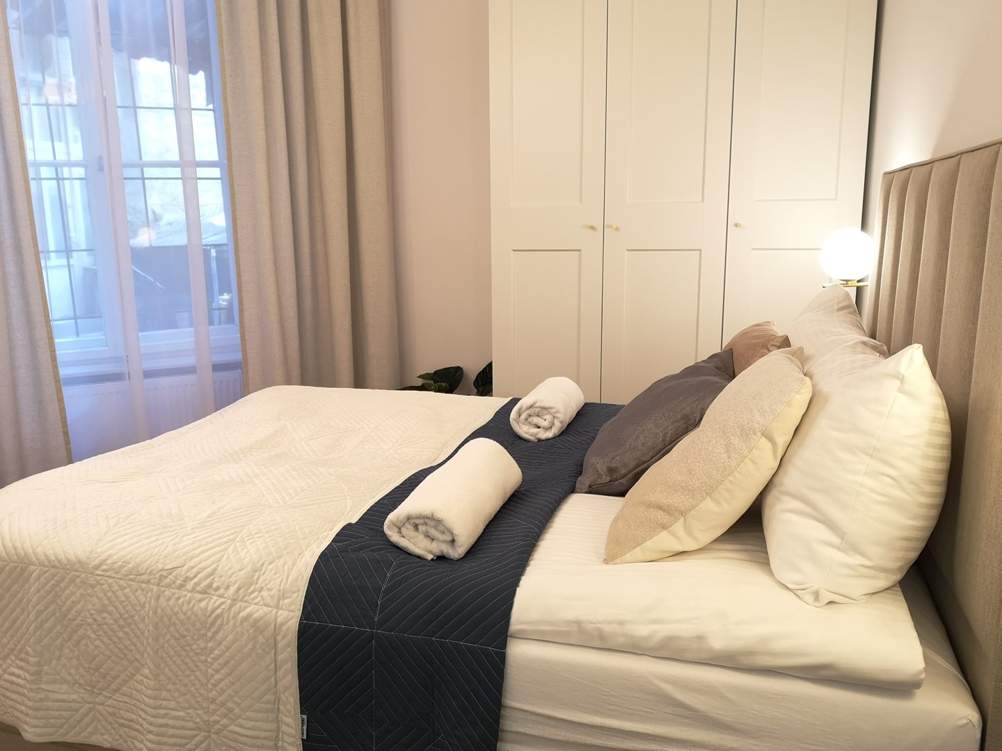 Duży, nowoczesny, dwupokojowy apartament dla 6 osób z balkonem wychodzącym na spokojne podwórko – osobna sypialnia z dwoma łóżkami pojedynczymi zapewnia wygodę dla grup.