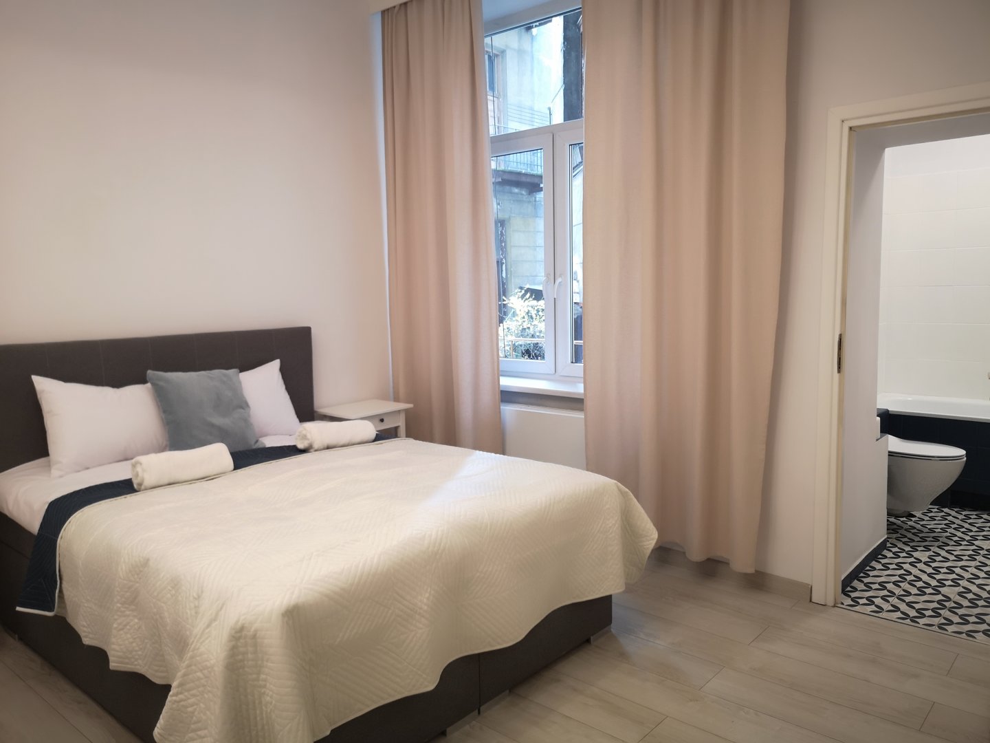 Przestronny apartament dla 2 osób z oddzielną kuchnią i balkonem na cichy dziedziniec – więcej przestrzeni i spokoju w samym centrum Krakowa.