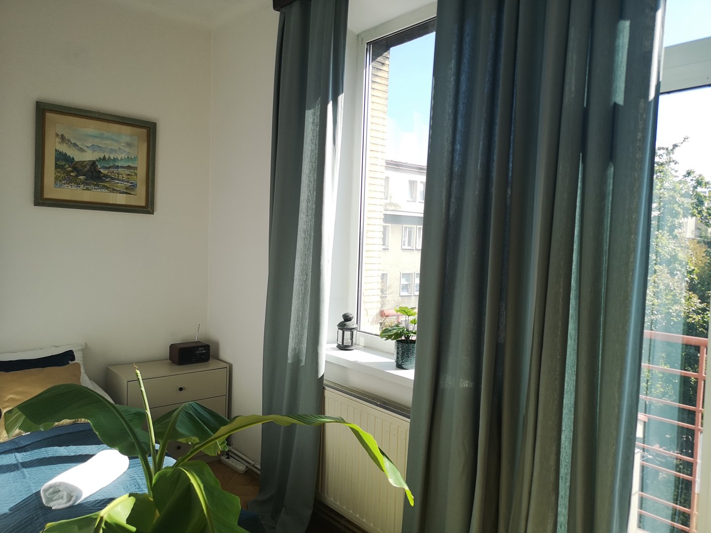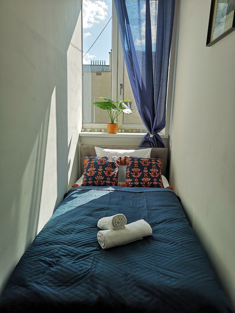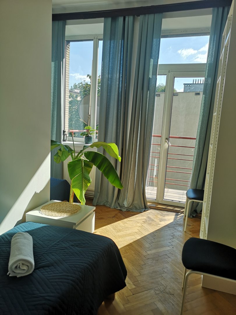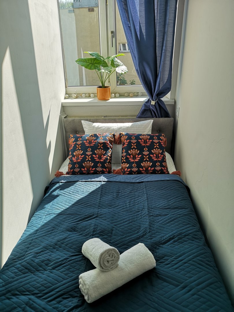 Duży, nowoczesny, dwupokojowy apartament dla 6 osób z balkonem wychodzącym na spokojne podwórko – osobna sypialnia z dwoma łóżkami pojedynczymi zapewnia wygodę dla grup.